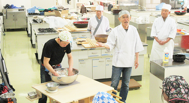最初に、講師の方のデモンストレーションを丁寧な解説とともに見学しました。あっという間に粉が生地へと練り上げられ、延ばされて切られていくプロのそば打ちに、参加者の皆様から時折感嘆の声が上がっていました。