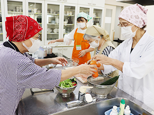 講義の後、“免疫力アップのレシピ”を教えていただきました。メニューは、「もち麦入り十六穀米、蒸し鶏のベジジュレソースかけ、ゴーヤのからし酢味噌風味白和え、カラフルピクルス、あおさとえのき茸のすまし汁」です。ボランティア学生と一緒に調理し、見た目も鮮やかな料理が出来上がりました。
