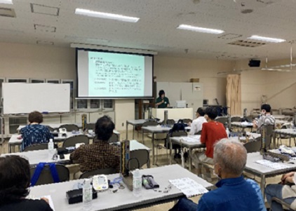 前半は本学の松吉教員による健診制度の概要や、検査項目と病気との関係についての講義があり、参加者には、ご自身の検査結果を見ながら、熱心にメモを取られる様子がありました。