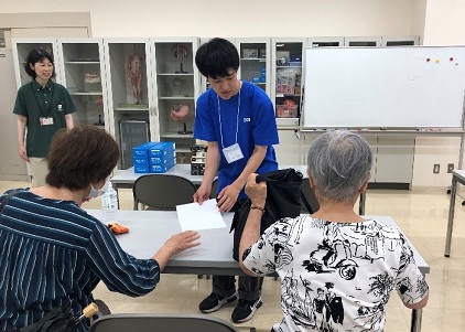 後半は、座る、立つ、寝る、運動直後、運動5分後の条件で、左右上腕、足首での血圧測定を行い、条件や測定部位による血圧の違いを実感していただきました。また水銀血圧計と聴診器による血圧測定では、聴診器を腕の血管にあて予想される血圧値に少し上乗せした値まで加圧し、だんだんと減圧して脈音が聴こえた時の血圧値を最高血圧、聴こえなくなった時の血圧値を最低血圧として体験しました。初めて聴診器をつけ、自分の脈音をじっくり聴いていらっしゃる方も見えました。その他に骨密度測定やヘモグロビン値測定も実施しました。「とても勉強になり、今後の健康維持に活かしたい」というコメントを多数いただきました。