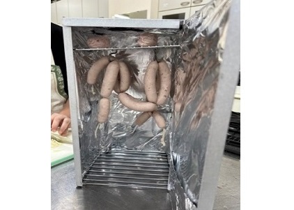 仁科先生 (本学健康栄養学部 教授) の指導の下、学生ボランティア7名と協力しながら、最初に豚ロース肉の角切りをミートチョッパーでひき肉にして、調味料や塩漬剤を加えてソーセージのたねを作りました。続いて、スタッファー (たねを羊腸に充填するための道具) を使って、羊腸にたねを詰めて形を整えた後、加熱・冷却・燻製の工程を順に行ってソーセージが完成しました。出来上がったソーセージは、炒めたキャベツと一緒にパンに挟んでホットドッグにして、みんなで試食しました。「ソーセージがこのようにして作られていることを理解できた」「とっても美味しい」といった意見をたくさんいただき、あっという間に完食されていました。