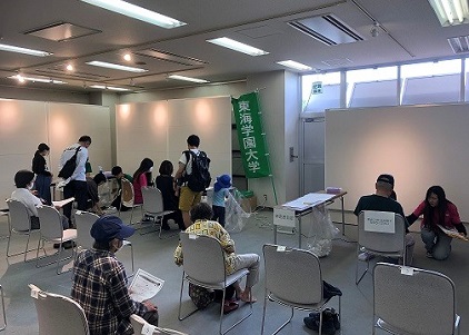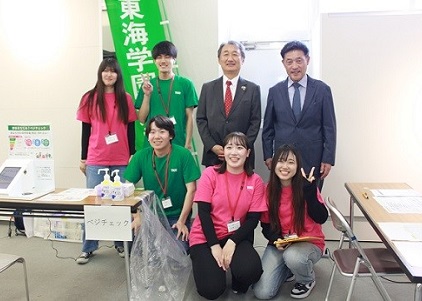 令和6年4月29日(月)、尾張旭市において「第20回あさひ健康フェスタ」が開催され学生ボランティア・教職員7名で参加しました。「クイズスタンプラリー」で、とうがくカレー、イチビキ様提供の商品を参加者約700名に配布しました。また「とうがく健康測定コーナー」では、参加者246名に骨密度、ベジチェック、足指筋力測定や検査結果説明を学生が担当しました。東海学園大学は尾張旭市と連携協定を締結しているため、石川清学長は激励に来ていただき、測定に参加もされました。爽やかな季節に汗を流し健康づくりを考えるフェスタに参加したことで学生達は臨床知識の再確認、住民の皆様の健康づくりに寄与する貴重な経験が出来ました。