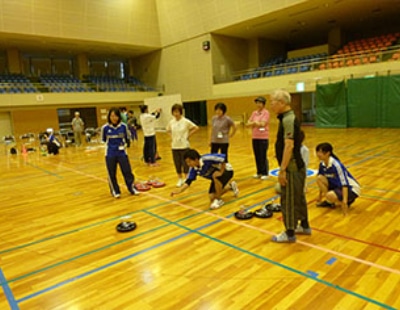天白スポーツセンターでの「カローリング」氷の上でのカーリングに近く、的に近づけ点数を競います。受講生の皆さんも学生も初めての体験、コツがつかめてくると楽しさも倍増です。