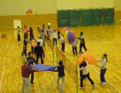 ニュースポーツのエアボールに挑戦。3人一組でパラシュートを持ち、ふわふわしたボールを相手コートへ!