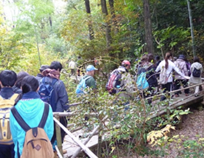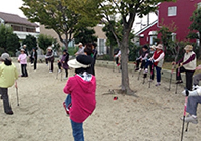 2本のポールを使って下肢だけでなく上半身の運動ともなるポールウォーキング。名古屋キャンパス近くの天白公園を歩きました